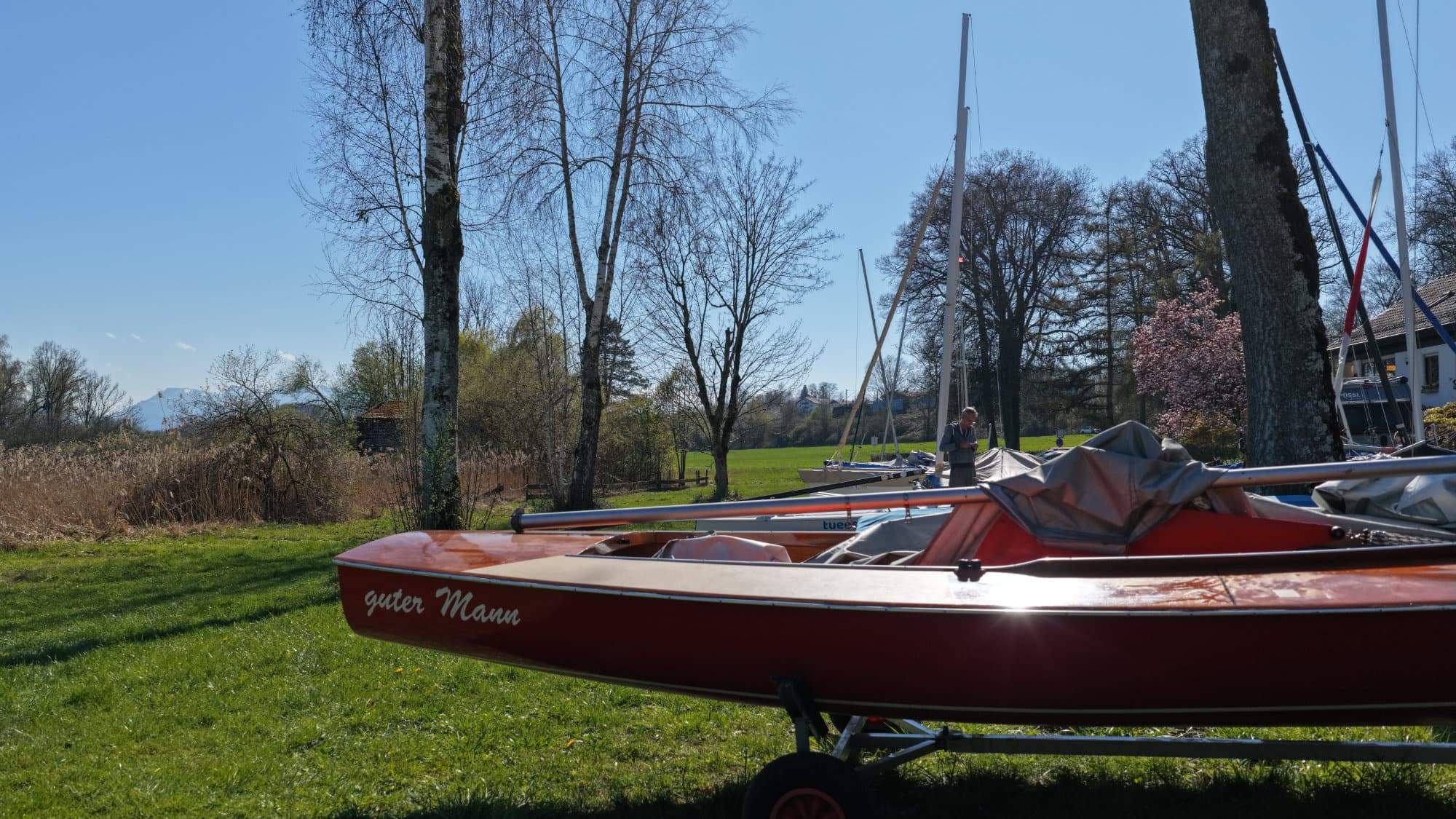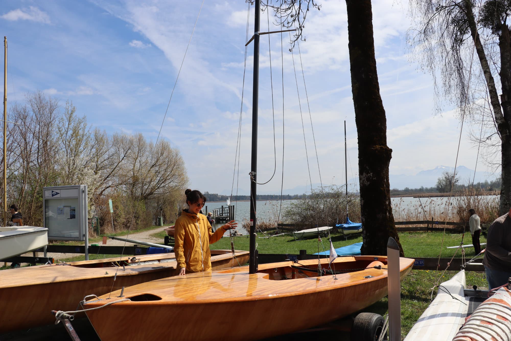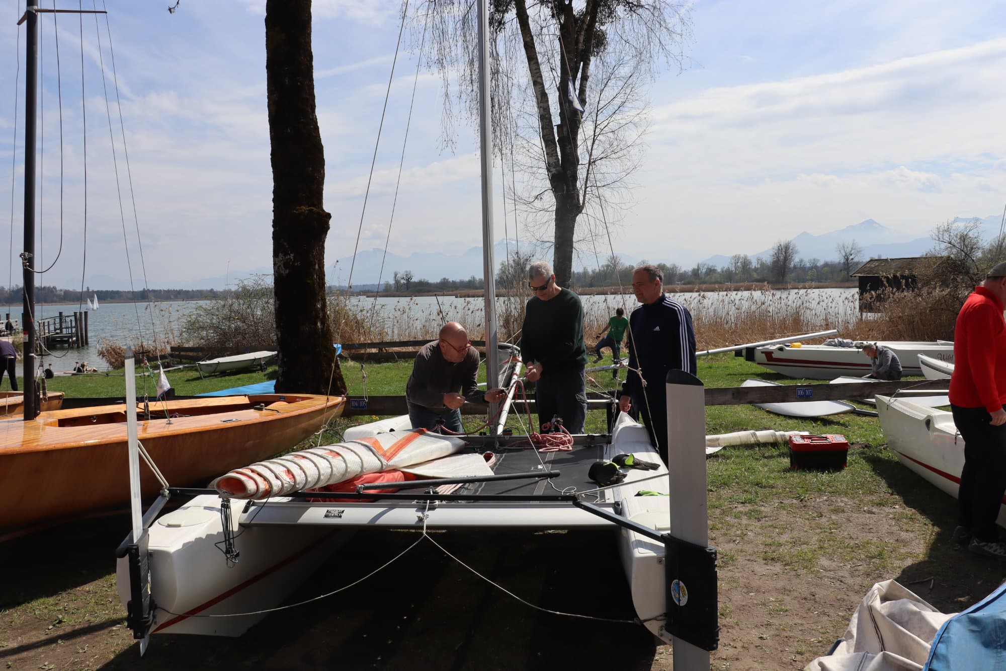 Besonders erwähnenswert war in diesem Jahr das Wetter. Während es am Tag davor und am Tag danach eher ungemütlich war – mit Temperaturen um die 10 Grad und reichlich Regen – hat uns der Samstag selbst mit bestem Frühlingswetter überrascht. Die Sonne zeigte sich von ihrer freundlichen Seite, und bei angenehmen 17 Grad ließ es sich hervorragend arbeiten. Fast könnte man meinen, dass auch der Wettergott ein Segler ist und weiß, wann wir ihn brauchen. Die guten Bedingungen sorgten für eine motivierte Stimmung auf dem Gelände.
